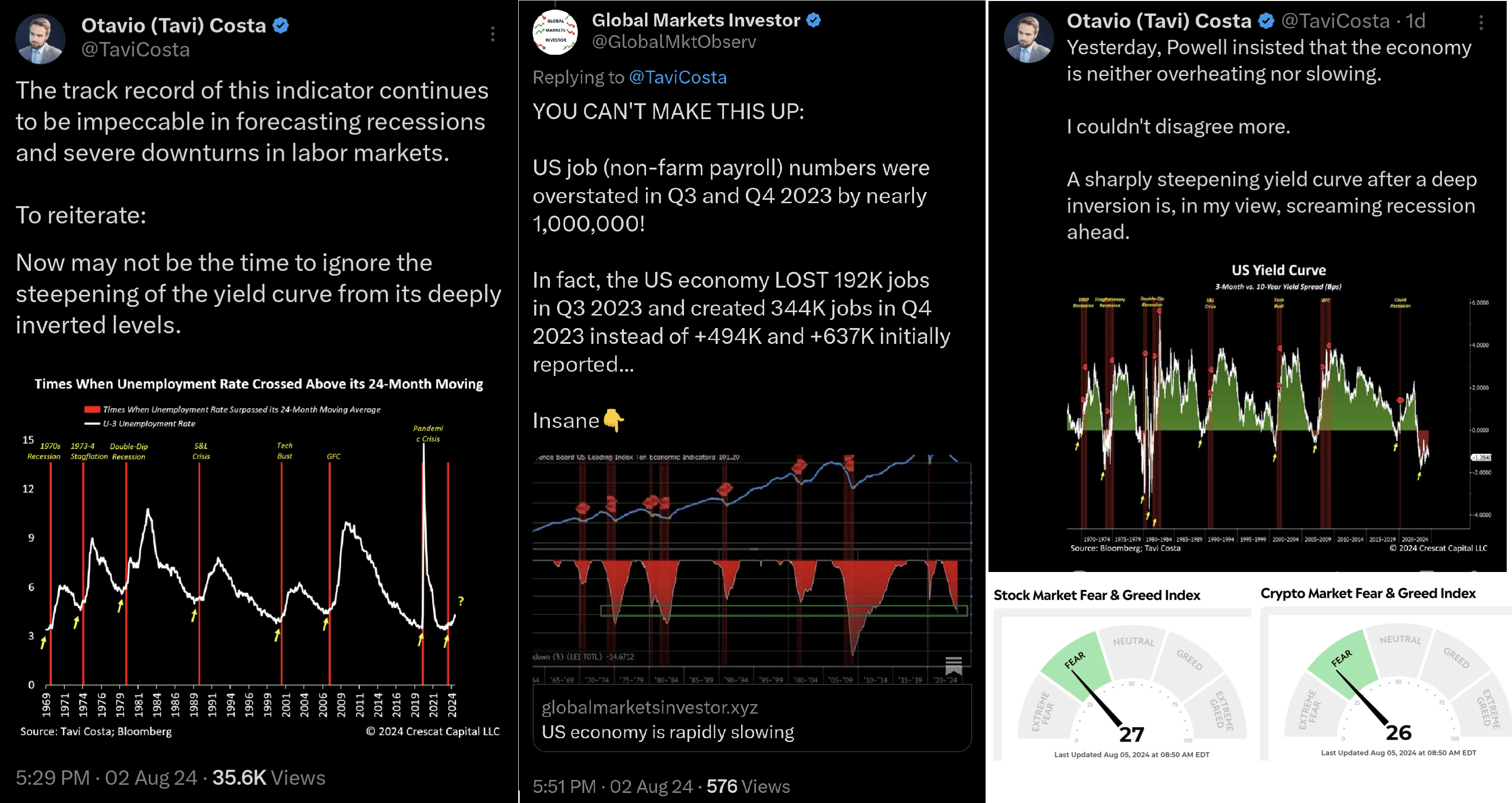 Jerome Powell řekl, že nevidí přehřívání ani zpomalování ekonomiky. Na grafu nahoře vpravo můžeme pozorovat otáčení výnosové křivky, která však naznačuje nástup recese. V kombinaci s prodeji akcií Warrenem Buffetem a vyostřováním konfliktu na blízkém východě je to doslova roznětka pro překoupené akciové trhy.