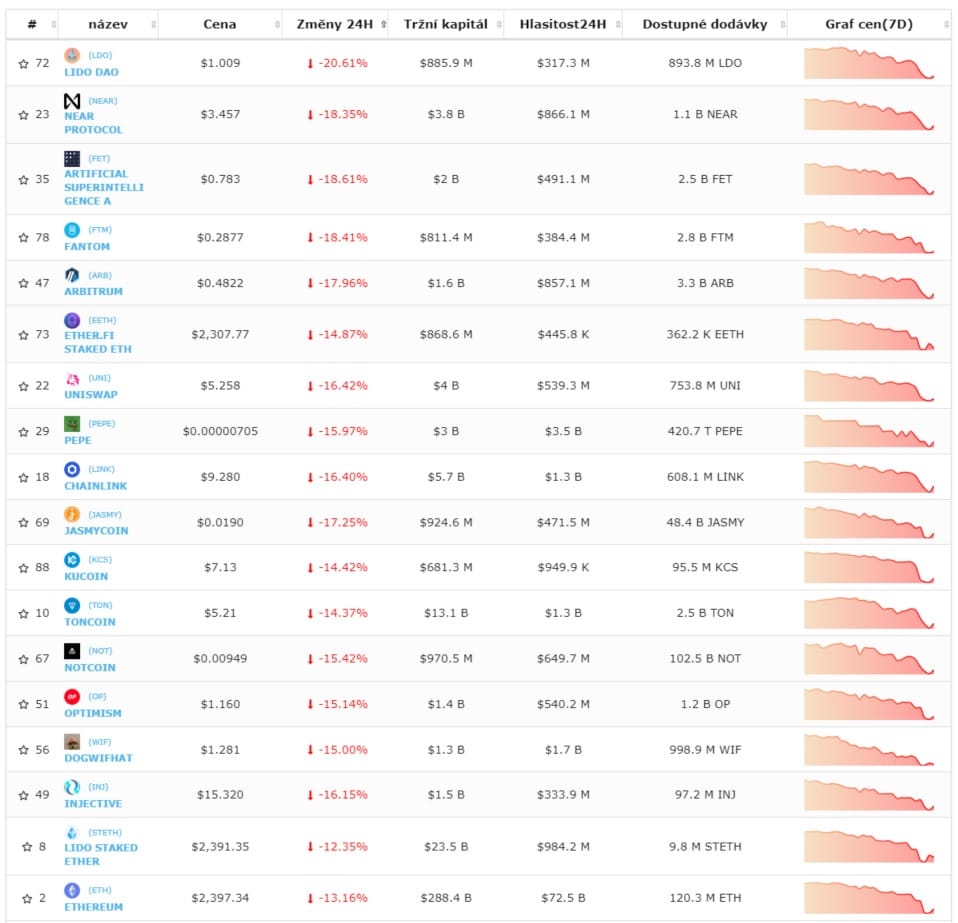 Sentiment investorů se lehce mění a na sociálních sítích lze pozorovat až paniku. Altcoiny včera odepisovali desítky procent. Tento printscreen byl pořízen po návratu Bitcoinu zpátky na 53 000 USD čím se část ztrát snížila. I tak je mnoho altcoinů, které už odepsali všechny letošní zisky. Mezi nimi je i Ethereum na kterém teď spekuluje většina krypto investorů.