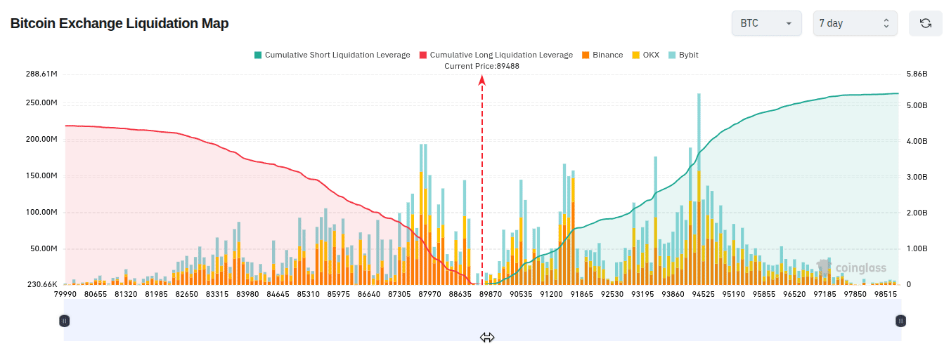 Nezapomenu samozřejmě ani na profesionální obchodníky s kryptoměnovými deriváty. Když se podívám na kumulovanou mapu likvidity za poslední týden, tak tam žádné extra jasné poselství neleží. V rámci pásma 5 000 USD nahoru i dolů leží téměř stejné množství likvidity (nad námi krapet víc). Tedy žádný jasný magnet k likvidaci.