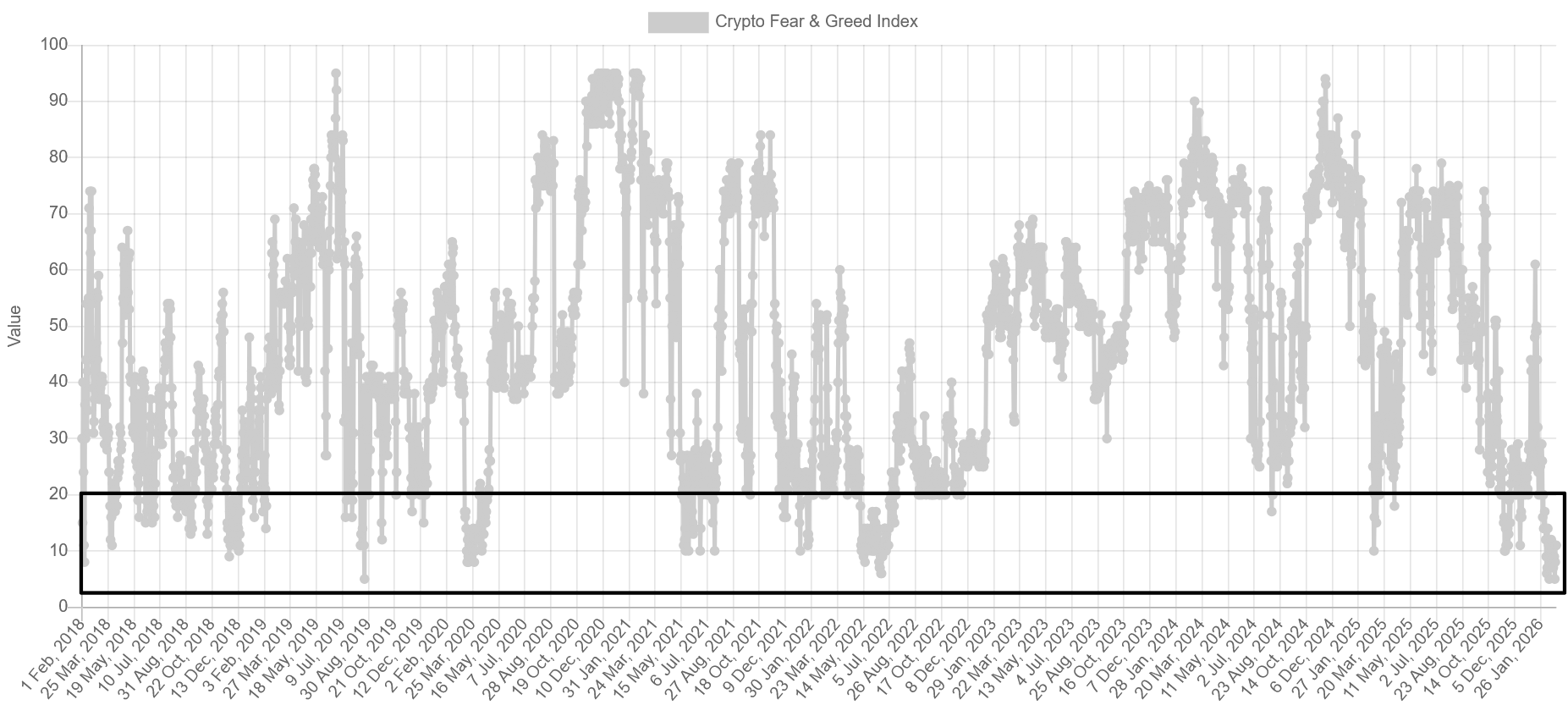 Sentiment ukazatele, jako je Fear and Greed Index, dnes naznačují, že psychologie na trhu s BTC je v hodně špatném stavu. Z historie ale vyplývá, že onen očistec nekončil během několika dnů. Často trval celé měsíce.