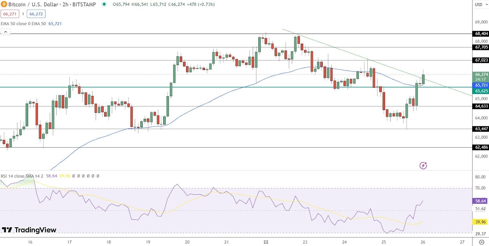 Bitcoin (BTC/USD) se v době psaní článku obchodoval za 66 947 USD, průlom nad sestupnou trendovou linií signalizuje potenciální nákupní trend, zejména pokud cena zůstane nad úrovní 66 000 USD.