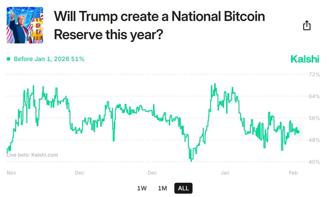 Podle predikčního trhu Kalshi existuje 52% pravděpodobnost, že Trump vytvoří národní bitcoinovou rezervu ještě letos.