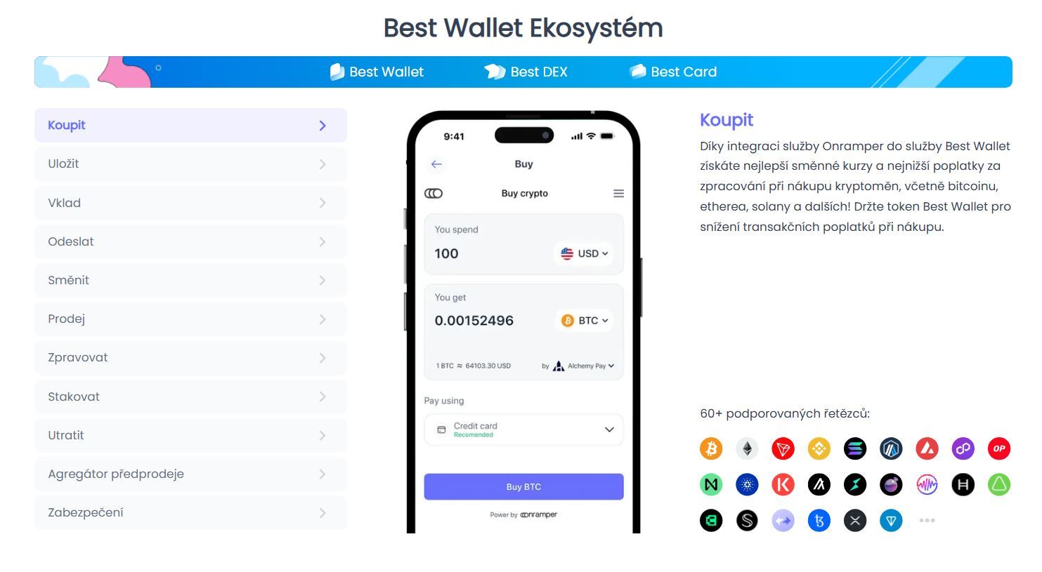 Best Wallet je inovativní samoobslužná kryptoměnová peněženka navržená pro uživatele preferující mobilní přístup k decentralizovaným aplikacím (dApps). Podporuje více než 60 blockchainů, což umožňuje uživatelům spravovat širokou škálu kryptoměn v rámci jedné aplikace. Peněženka nabízí funkce jako nákup, prodej, odesílání, přijímání a swapy kryptoměn, stejně jako správu portfolia a staking. Díky integraci s platformou Onramper poskytuje výhodné směnné kurzy a nízké poplatky při nákupu kryptoměn za fiat měny.