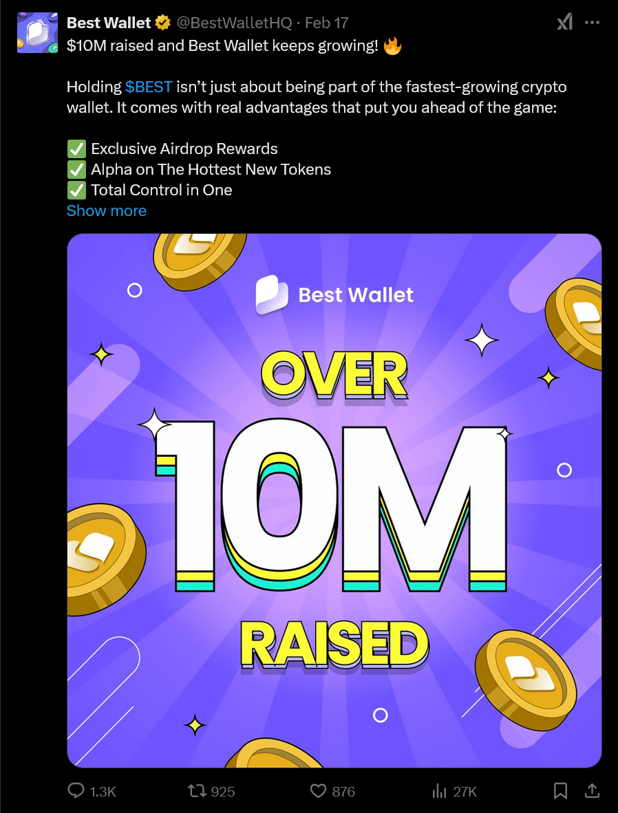 S tím, jak instituce i vlády zvyšují svou expozici vůči bitcoinu, roste i poptávka po bezpečných a uživatelsky přívětivých kryptoměnových peněženkách. Best Wallet se v tomto ohledu rychle stává jedním z nejlepších řešení pro správu digitálních aktiv. Navíc právě pořádá předprodej svého nativního tokenu BEST, který už přilákal miliony dolarů v investicích.