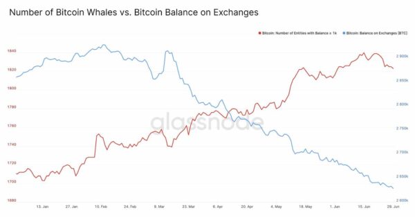 Masový exodus velryb z burz znamenal začátek obrovských výběrů jejich majetku z centralizovaných burz. To vedlo k situaci zobrazené na níže uvedeném grafu, kdy se pokles BTC zůstatku na burzách časově shodoval s rostoucím počtem velryb.