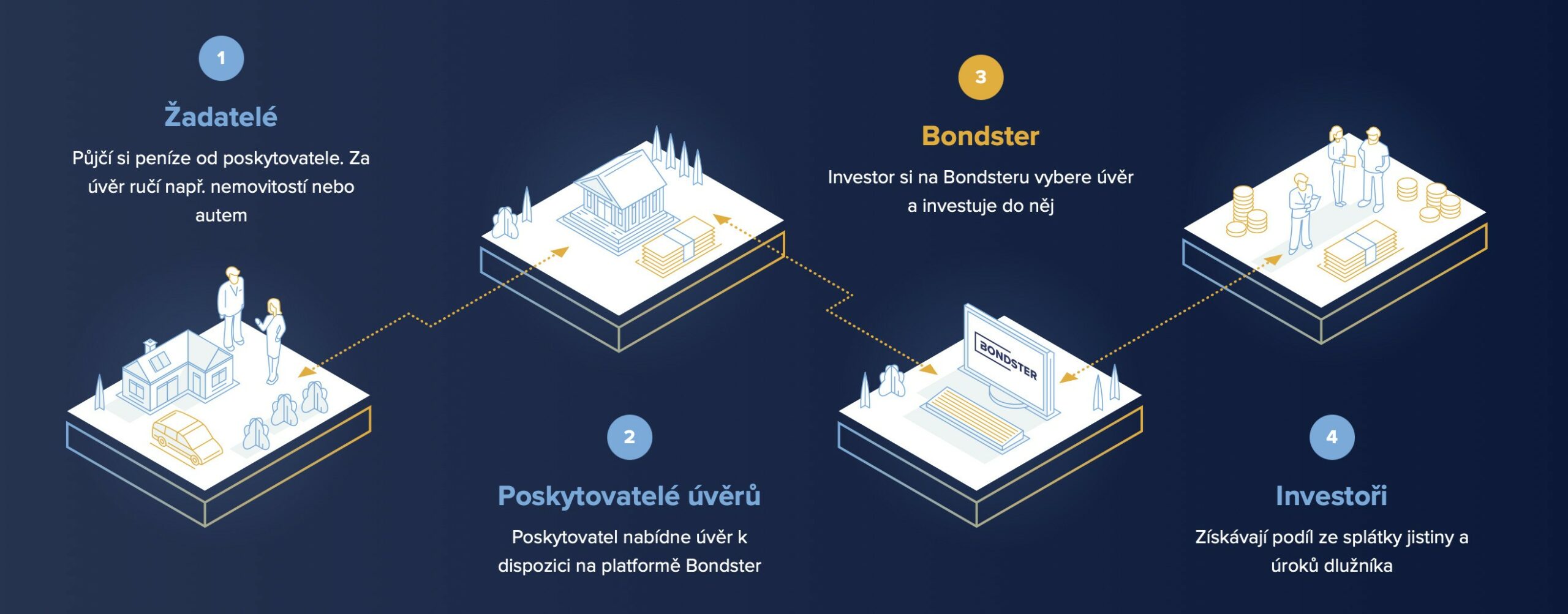 Bondster není klasická banka ani burza. Je to investiční tržiště (marketplace), které propojuje investory s prověřenými poskytovateli úvěrů (např. Acema, Ibancar, Lime). Místo abyste půjčovali peníze přímo Pepovi z Horní Dolní, půjčujete prostředky nebankovním společnostem, které je dále poskytují koncovým dlužníkům.