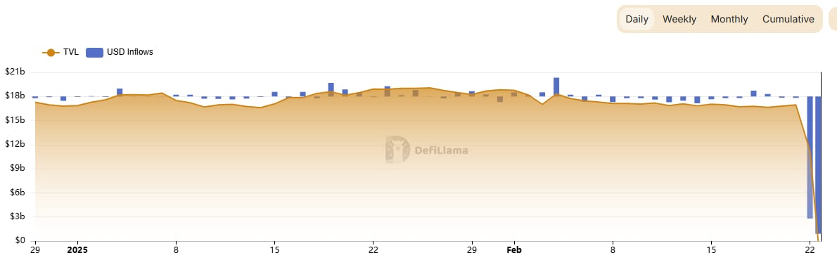Podle údajů DefiLlama se celková hodnota aktiv Bybitu během jediného dne od incidentu propadla o více než 5,3 miliardy dolarů, včetně 1,4 miliardy dolarů ztracených při hacku.