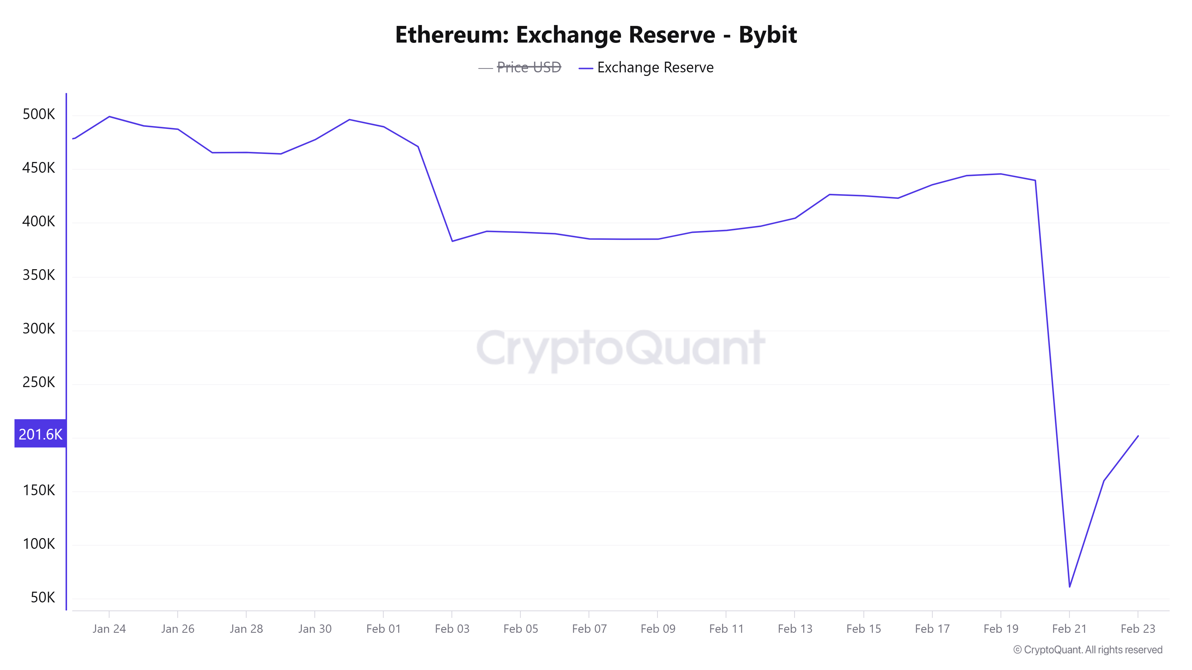 Dne 23. února držela burza Bybit přes 201 600 Etherů, což představuje více než 45 % z původních 439 000 ETH, které měla ve svých rezervách 20. února, den předtím, než ji hack za 1,4 miliardy dolarů dočasně snížil zásoby na pouhých 61 000 ETH.