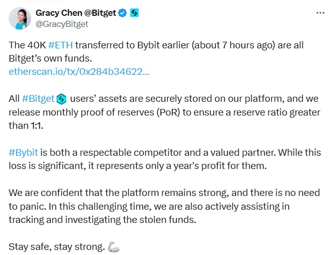 Přední kryptoměnové burzy a významné osobnosti odvětví okamžitě zareagovaly a poskytly Bybitu nouzové převody, včetně 50 000 Etherů od Binance, 40 000 Etherů od Bitgetu a 10 000 Etherů od Du Juna, spoluzakladatele HTX Group, spolu s dalšími podporovateli.