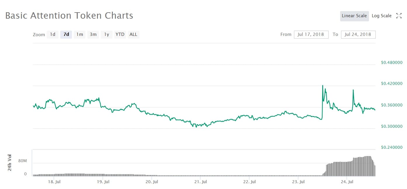 Stejně jako v případě Holo, tak i Basic Attention Token (BAT) zaznamenal nárůst na své hodnotě poté, co byl zalistován na kryptoburzu Upbit. Zatímco před přidáním obchodního páru na výše zmíněnou burzu se BAT obchodoval přibližně za 0.33 USD, po zalistování jeho cena vzrostla na 0.421 USD. I v tomto případě se majoritní část denního volume přesunula na Upbit, kde tvoří 55 % všech obchodů této kryptoměny.