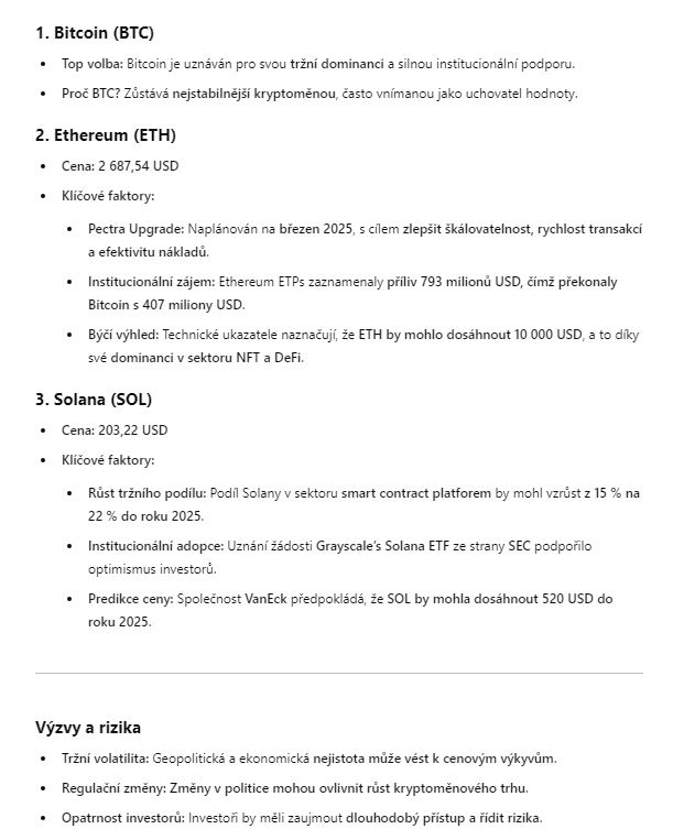 Když model dostal za úkol vybrat další aktiva s vysokým růstovým potenciálem, zvolil ethereum (ETH) a solana (SOL). Hlavní důvody pro tuto predikci jsou expanze ekosystémů, rostoucí zájem institucionálních investorů a příznivé tržní podmínky, které naznačují, že ETH a SOL budou patřit mezi nejvýnosnější kryptoměny roku 2025.