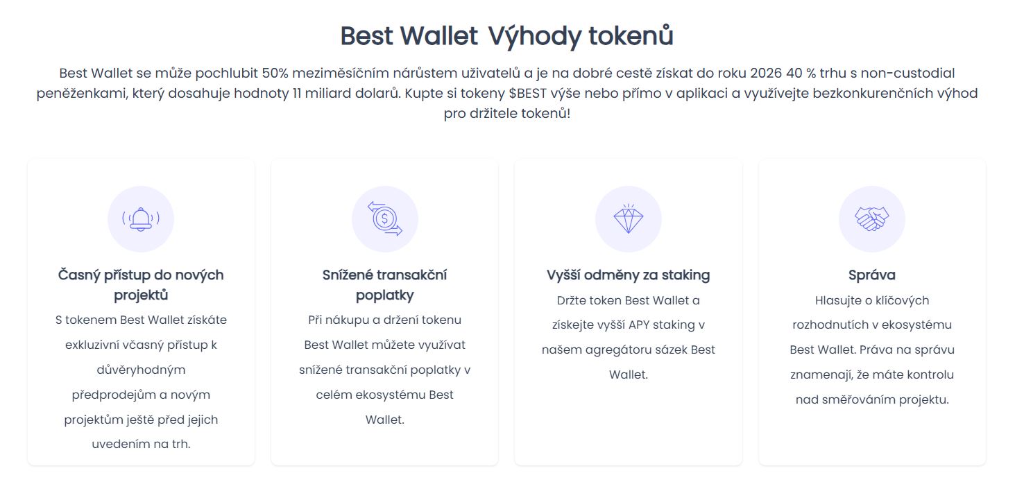 Token BEST hraje klíčovou roli v celém ekosystému Best Wallet. Držitelé tokenu mohou využívat exkluzivní výhody, jako jsou snížené transakční poplatky, vyšší staking odměny a přístup k novým projektům v rámci agregátoru předprodejů. Stakingový protokol BEST nabízí vysoké roční zhodnocení až 170 % již nyní, přičemž odměny jsou dynamicky rozdělovány po dobu tří let. Tento model nejen motivuje uživatele k dlouhodobému držení tokenů, ale zároveň pomáhá stabilizovat cenu na trhu.