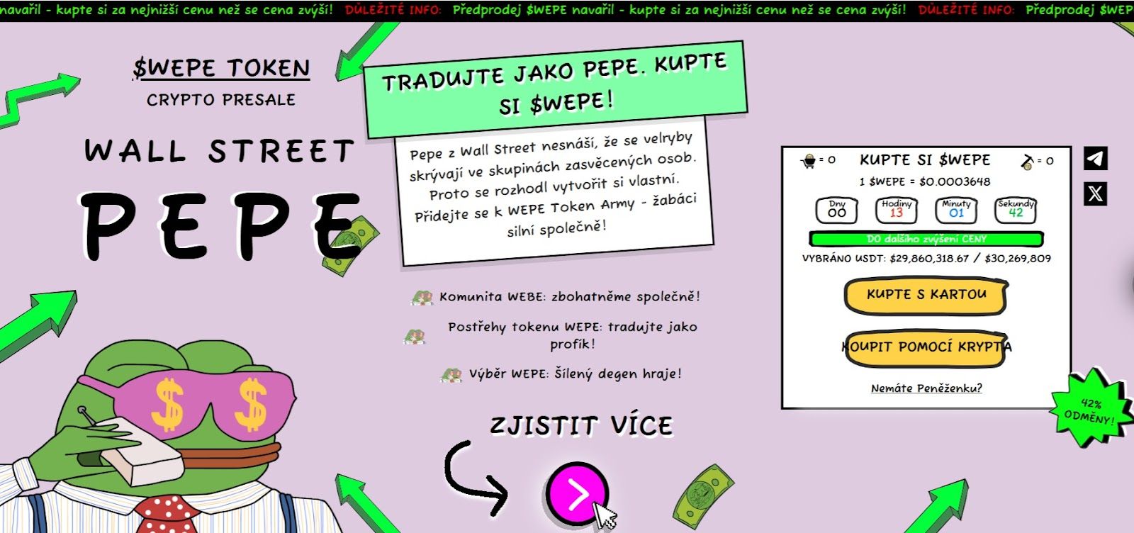 Nyní mohou včasní investoři využít předprodejní nabídky, ve které najdou token WEPE za výhodnější ceny ještě předtím, než bude zalistován na decentralizovaných burzách a jeho cena se zvýší. Předprodej probíhá na oficiálních webových stránkách projektu s tím, že tokeny si lze pořídit výměnou za ETH, USDT, BNB a nebo pomocí kreditní karty. I přes to, že předprodej Wall Street Pepe běží jen několik málo dní, tak už se podařilo získat od včasných investorů přes 30 milionů dolarů, což jasně ukazuje jak moc investoři této nové kryptoměně věří.
