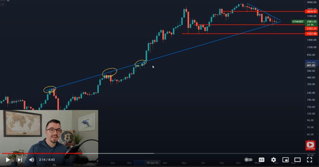 Youtuber uvedl, že na grafu ETH „máme trendovou linii, která sahá od listopadového maxima.“ Od té doby se cena etherea nebyla schopná dostat na vyšší maxima a ETH naopak tvořilo nižší maxima.