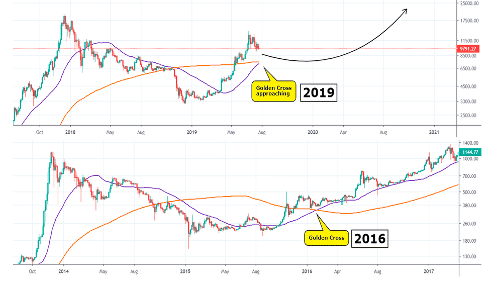V roce 2016 stejná formace Golden Cross vyústila v začátek nové agresivní býčí vlny v období Býčího cyklu 2016-2017. Zajímavou skutečností je, že cena se dotkla MA200, konsolidovala zde několik měsíců a poté zahájila novou agresivní long etapu. Pokud bude tentokrát dodržen podobný vzorec, pak můžeme čekat růst bitcoinu k zajímavým hodnotám až 25 000 USD (autorův osobní názor).