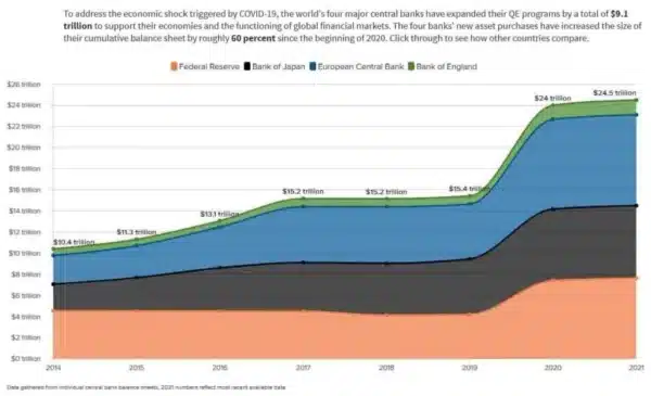 Údaje získané společností Finbold ukazují, že přední světové centrální banky, včetně Federálního rezervního systému, Bank of Japan, Evropské centrální banky a Bank of England, napumpovaly od roku 2008 do světové ekonomiky více než 25 bilionů dolarů, přičemž více než 9 bilionů dolarů z této částky pochází pouze z programu COVID-19. Údaje přinesla organizace Atlantic Council, která se zabývá sledováním kvantitativního uvolňování.