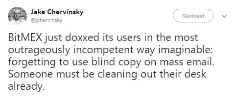 Jeden z uživatelů BitMEXu zaslal na Twitter e-mail, který od kryptoburzy obdržel, a to s upraveným seznamem dalších e-mailových adres, které jej rovněž obdržely.