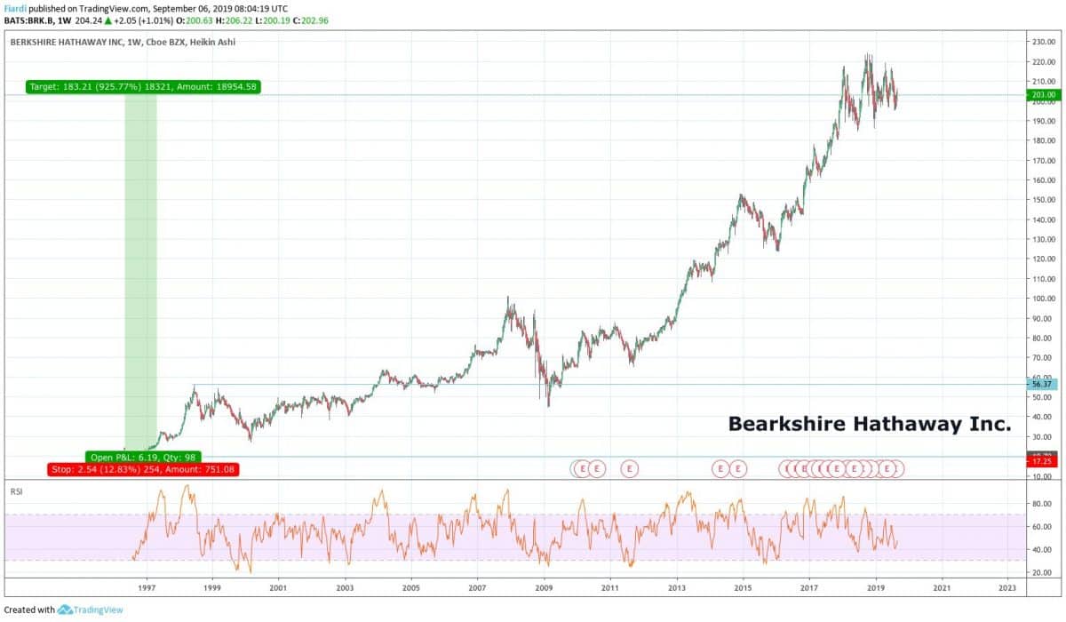 Jaké by to bylo, pokud byste investovali do Berkshire Hathaway? No, vskutku byste si řádně přišli na své. Společnost se stala veřejně obchodovatelnou společností 06.05.1996. Její akcie se prodávaly nejníže za 19,78 USD (27.05.1996) a momentální hodnota je 203 USD. Pokud byste investovali v roce 1996, dnes by Váš vklad představoval zhodnocení úctyhodných 925%