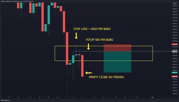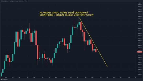 Na obrázku pod textem vidíte týdenní graf BTC/USDT, kde máme definovaný klesající trend. To znamená, že budeme hledat vstupy do shortových obchodů.