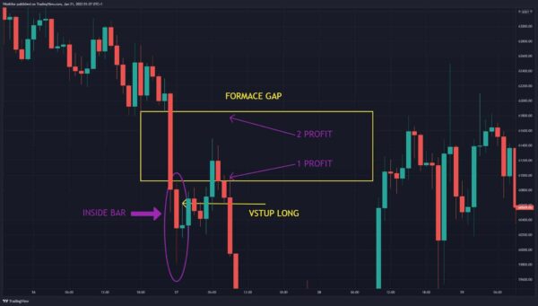 Chci vidět jednu nebo ještě lépe dvě dlouhé prodejní svíčky, po kterých se vytvoří inside bar. Logika celého setupu je taková, že prodejní reakce na trhu byla příliš poháněná emocemi. Inside bar mi naznačuje, že účastníci na trhu se zklidnili a začínají s menšími emocemi uvažovat o hodnotě podkladového aktiva. Pokud dojde k proražení inside baru ve směru long, bude mít pohyb s velkou pravděpodobností pokračování. To proto, že na trhu budou chtít testovat v oblasti, kudy cena při prudkém výprodeji doslova prolétla.
