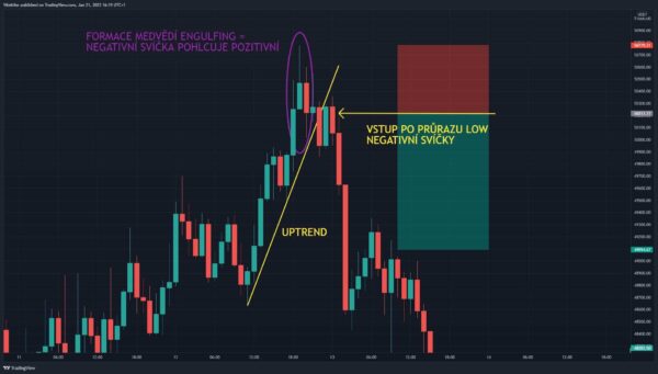 Při uptrendu cena testuje výše a hledá prodávající. Když zaznamenám velký sklon uptrendové linie a dokonce několik svíček, které jsou rostoucí, a nemám žádnou korekční svíčku nebo alespoň svíčku, která by se vytvořila na podobných cenových úrovních jako ta předchozí , tak vytvoření prodejní svíčky, která pohltí celou poslední růstovou svíčku, vnímám velmi silně.