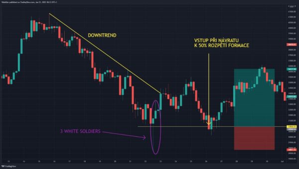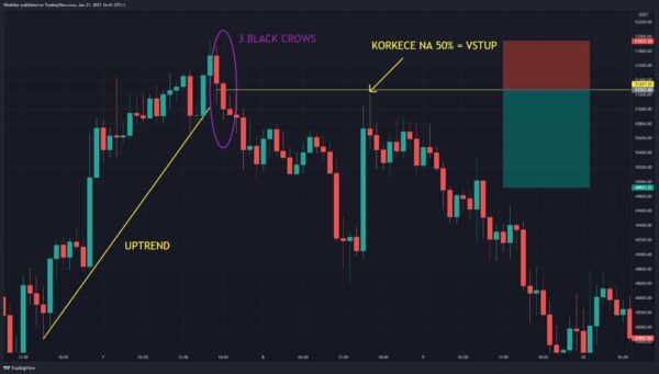 Co se týče vstupů, tak není vhodné vstupovat po proražení 3. klesající svíčky. Po takto významném pohybu je velká pravděpodobnost alespoň krátkodobé korekce proti prvotnímu výprodeji. Je tedy lepší si pro vytvoření této formace počkat na návrat ceny do oblasti cca 50% rozpětí celé formace. Nebo je možné hledat vstup na nižším časovém rámci a využít některou z rezistencí popsaných v minulém článku.