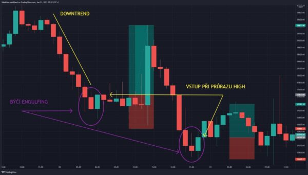 Při downtrendu cena testuje níže a hledá nakupující. Když tedy zaznamenám velký sklon downtrendové linie a dokonce několik svíček, které jsou klesající, a nemám žádnou korekční svíčku nebo alespoň svíčku, která by se vytvořila na podobných cenových úrovních jako ta předchozí, tak vytvoření nákupní svíčky, která pohltí celou poslední klesající svíčku, vnímám velmi silně.
