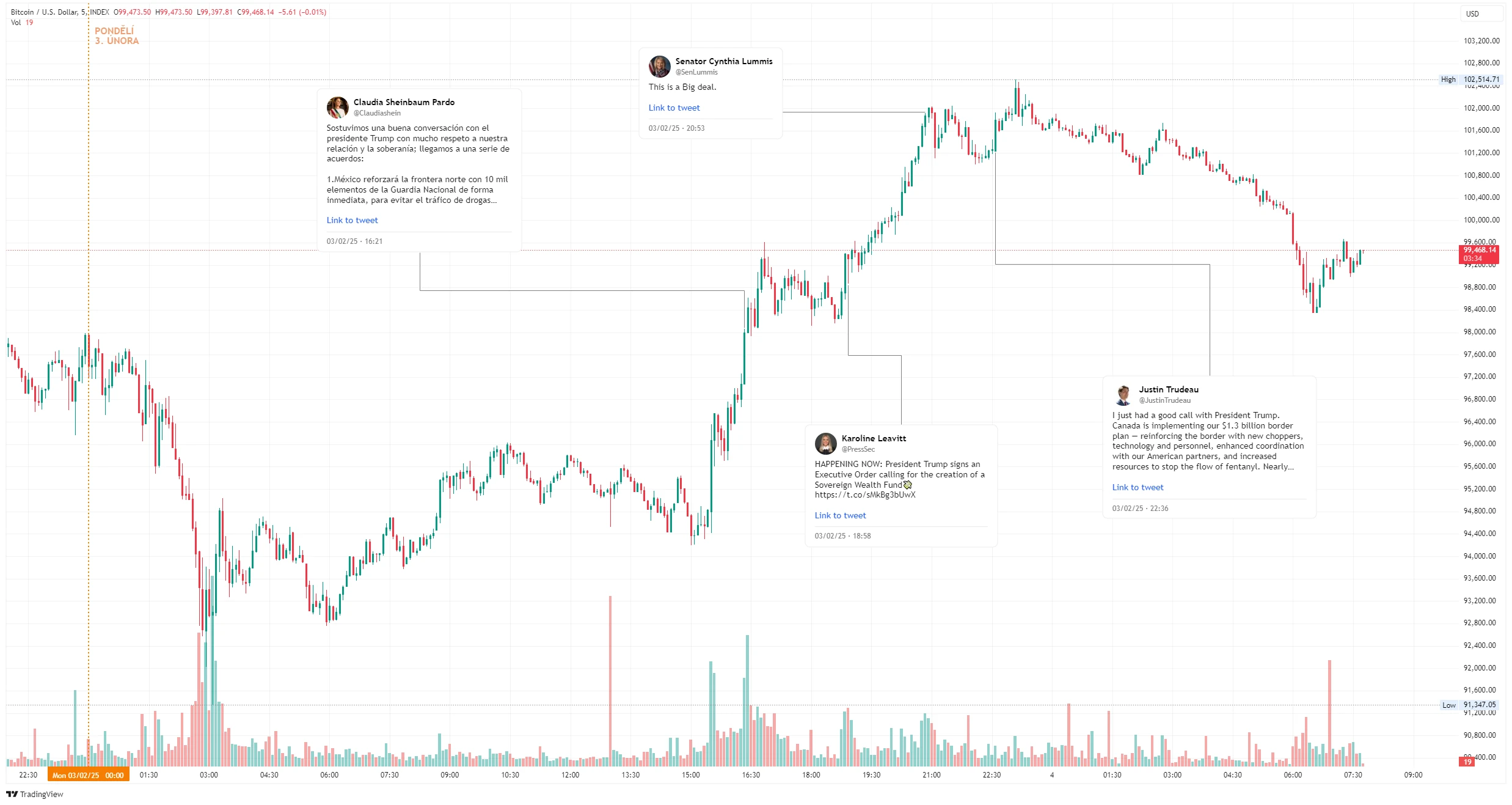 Donald Trump Trump podepsal další exekutivní příkaz, tentokrát uvalující cla na zboží vyrobené v Mexiku, Kanadě a Číně. Akciové i kryptoměnové trhy reagovaly bouřlivě a některé propady vytvořily nové rekordy na Wall Street. To vše se ale rychle uklidnilo v momentě odložení cel pro Mexiko a Kanadu a zahájení vyjednávání s Čínou.