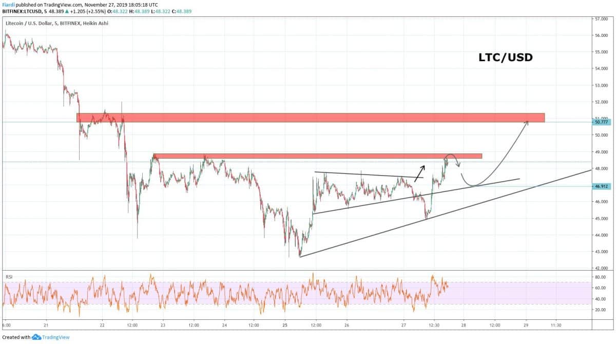 Právě dnes jsme na LTC / USD viděli ukončený triangl směrem nahoru. Tento triangl by mohl odstartovat několikatýdenní bull run. Momentální hodnota LTC je 48,1 USD a podle predikce bychom ho mohli vidět o 2-3 dny na hodnotách 51 USD.