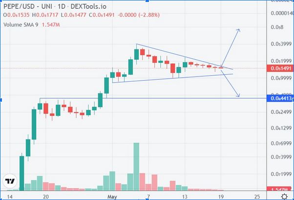 Podle DEX Tools se PEPE v době psaní tohoto článku obchoduje za cenu kolem 0,0000015 USD. To je o více než 60 % méně než nedávná maxima této kryptoměny 0,0000040 USD.