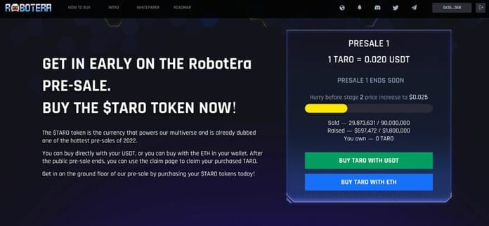 Jak jsme již zmínili, RobotEra se v současné době pohybuje v první fázi předprodeje s tokeny $TARO, které aktuálně stojí 0,02 USD. Celkem proběhnou tři etapy, v každé etapě se prodá 90 milionů tokenů a celkem 270 milionů – to představuje 15 % maximální nabídky (1,8 miliardy) TARO.