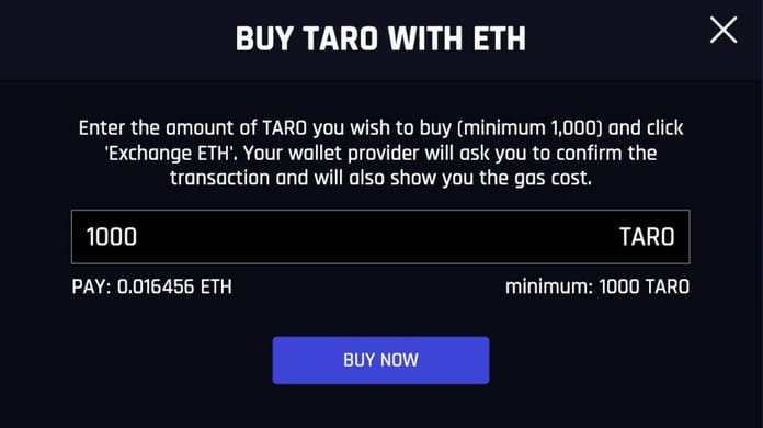 Objeví se tabulka, kde si určíte o kolik tokenů TARO máte zájem. Minimální počet tokenů TARO, které můžete zakoupit je 1 000 kusů. Maximální počet není stanoven. Poté klikněte na tlačítko ‚Buy Now‘.