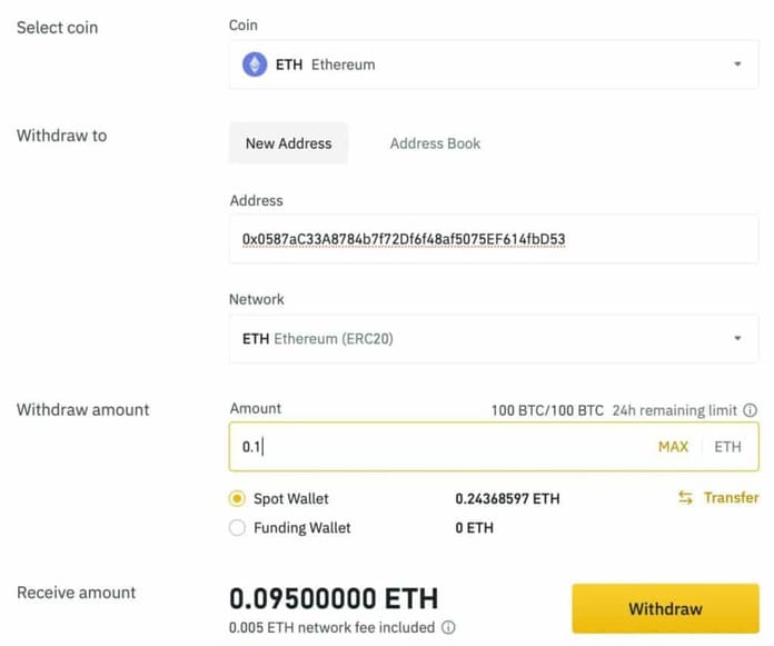 Jak jsme již zmiňovali v kroku výše, pokud na některé krypto burze jako je Binance, Coinbase či eToro, již ETH či USDT držíte, jednoduše jej převeďte do své MetaMask peněženky. Například na burze Binance můžete lehce přejít do své peněženky – ‚Wallet‘ a u ETH, které držíte byste klikli na možnost ‚Withdraw‘.