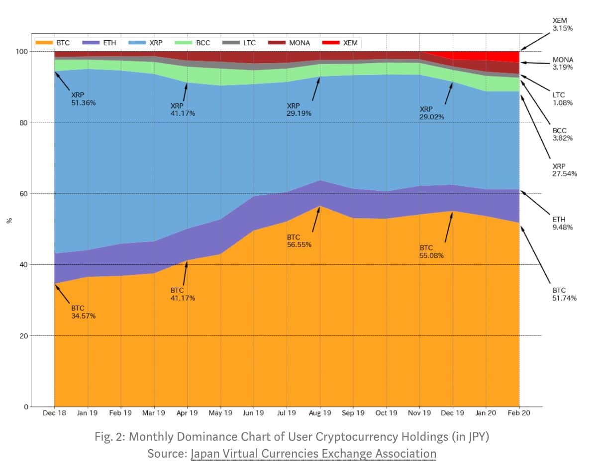 V prosinci 2018 byla měsíční dominance XRP 51,36 %, zatímco Bitcoin se pohyboval na 34,5 %. Podle posledních dostupných údajů z února 2020 byla dominance XRP 27,54 %, zatímco Bitcoin vyrostl na 51,74 %.