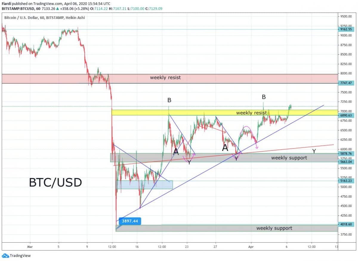 Pokud se dostatečně dlouho udržíme na BTC nad 7 000 USD, jsou vyhlídky na dosažení 7 700 USD ještě v tomto týdnu dost příznivé. Situace trochu připomíná minulý týden, když jsme stejně velkou pumpou otevřeli obchodní týden na světových trzích. V pondělí jsme viděli obrovský růst, který byl však v úterý téměř celý vymazán. Je nutné si dávat SL a pozorně sledovat i fraktální podobnost grafů z minulého týdne.