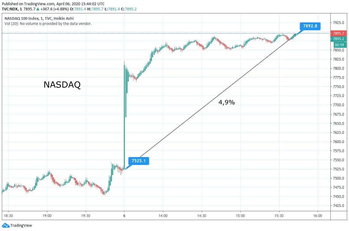 Jak můžeme vidět na grafu, tak hned po otevření obchodování NASDAQ posílil o 4,9 % k současné hodnotě 7 895 USD. V první den obchodování se tedy zdá, že bulls budou chtít vymazat letošní ztráty, které od high k low v roce 2020 představovaly ztrátu až 30,45 %. Momentální ztráta za rok 2020 činí „už jen 19,14 %“.