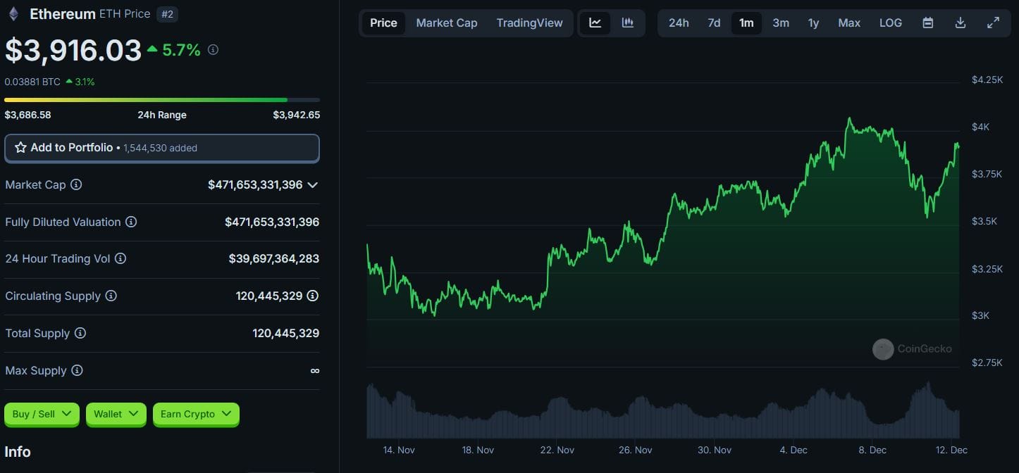 - Cena Etherea k 12. prosinci 2024: 3 904,11 USD