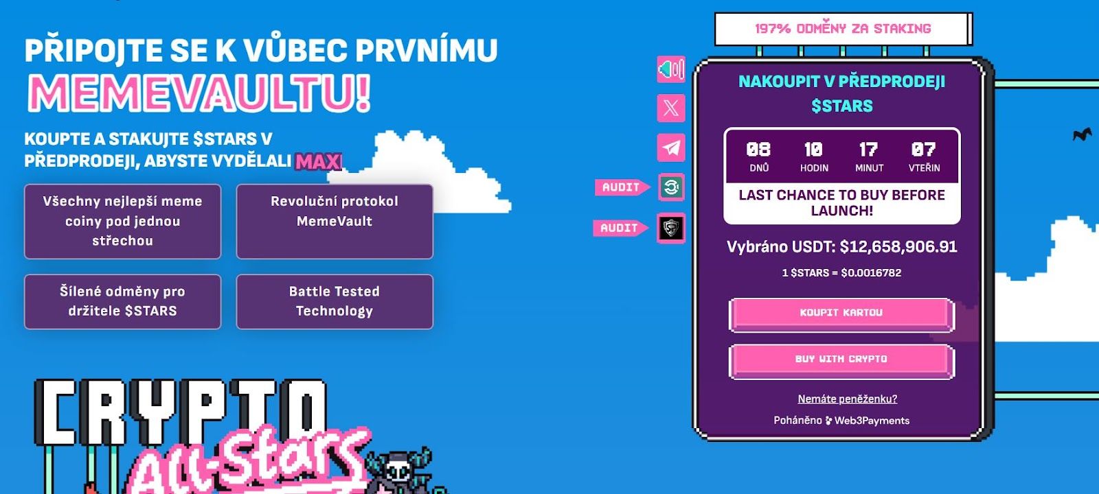 Crypto All-Stars přichází s unikátním stakingovým protokolem MemeVault, který umožňuje stakování více meme coinů na jednom místě. Uživatelé budou získávat odměny ve formě tokenů STARS. Tento inovativní přístup nejenže maximalizuje uživatelský komfort, ale také zajišťuje vyšší efektivitu. Také stojí za zmínku vysoká úroveň bezpečnosti díky důkladným auditům platformy. MemeVault je ideální volbou pro investory, kteří hledají pasivní příjem a zároveň chtějí podpořit růst meme coinů.