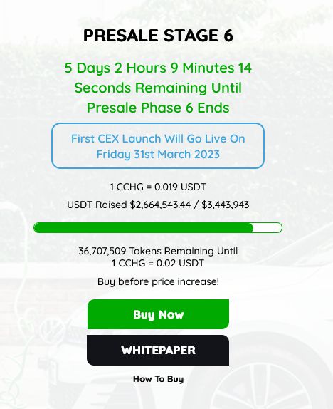 Tokeny $CCHG si v současné chvíli můžete pořídit v předprodeji, ve kterém se postupně dostávají do dalších a dalších fází. V době psaní tohoto článku se nachází předprodej v 6. fázi z celkových 10. Stále tak máte čas si tokeny za sníženou cenu zakoupit. Ke konci předprodeje a po uvedení na směnárny je obecně platné, že ceny kryptoměn rostou.