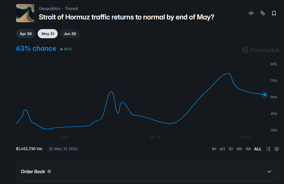 Predikční trh Polymarket drží v době psaní článku kurz 63 % na normalizaci plavby Hormuzským průlivem do 31. května. Víkendové příměří nevydrželo ani 24 hodin.