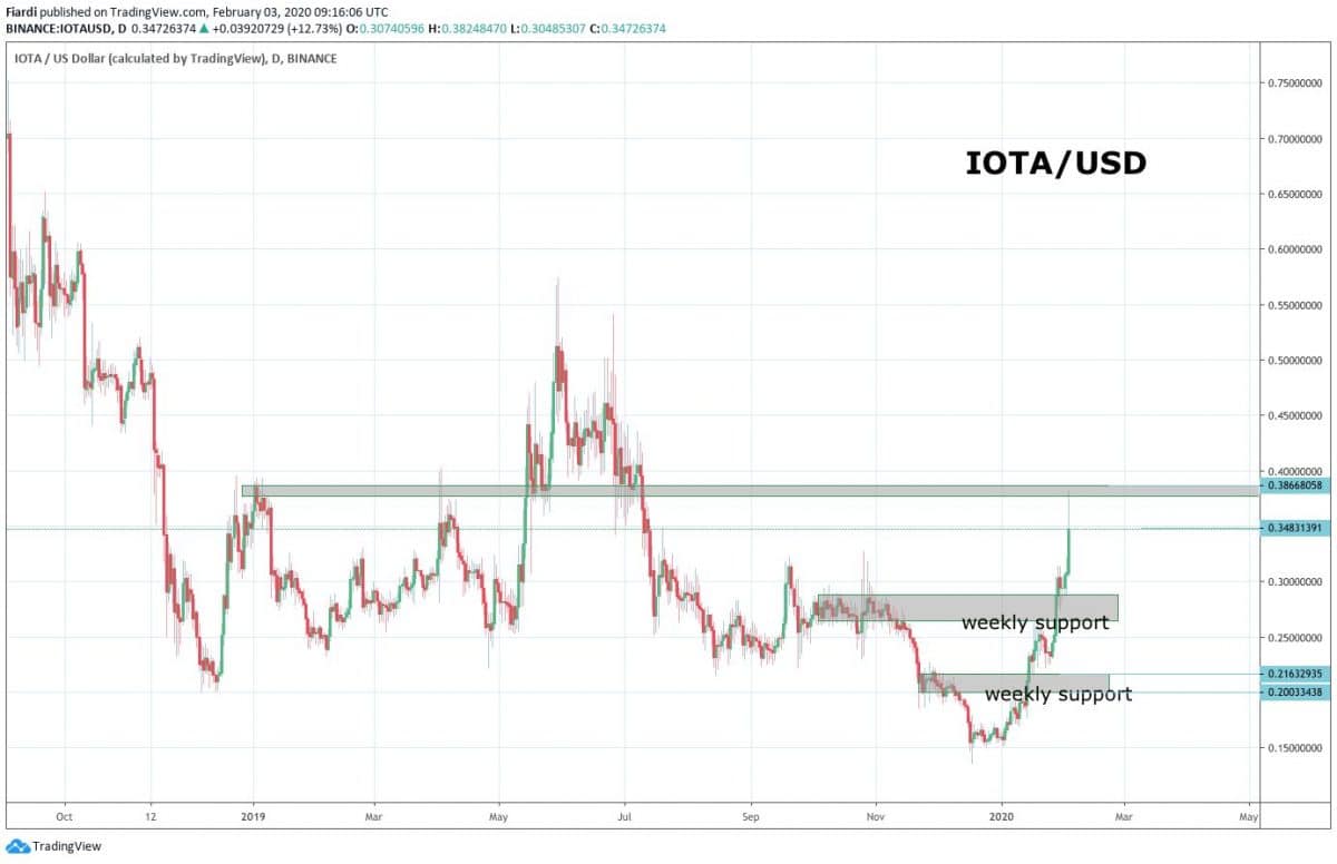 Při pohledu na graf vidíme rok 2019 až po současnost. Není to až tak daleko na roční high kdyby IOTA přidala na růstu ještě 33%. Celkově v roce 2020 má 120%, to je neskutečná pumpa a IOTA to rozjela ve velkém resp. marketingové oddělení + vývojáři. Nejbližší odpor vidíme na 0,386 USD. Nejbližší podporu hluboko dole až na 0,28 USD. Momentálně se pohybujeme na 0,349 USD. Růst může pokračovat, protože ten nejnovější fundament je Oddyssey 2020, která bude trvat 4. – 5.02. 2020. Druhý fundament je z pátku 31.01, a to listing na Bittrex global. Kombinace těchto dvou fundamentů katapultovala IOTU nahoru.
