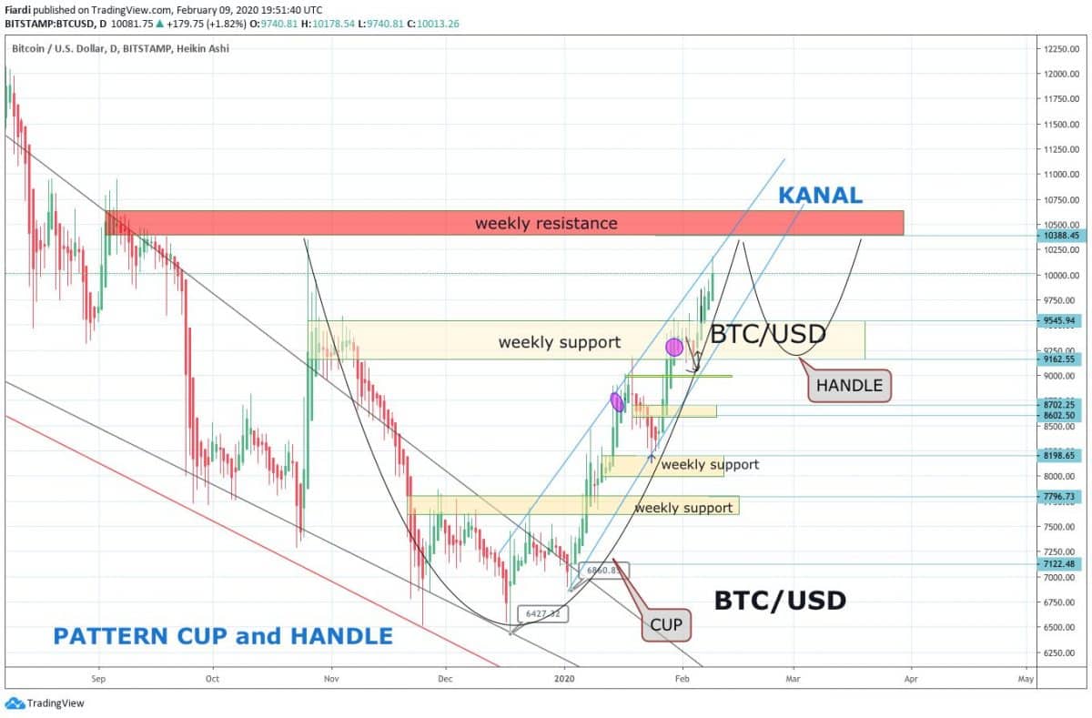 Bitcoin včera přidal na růstu 3% a dostal se na současnou cenu v době psaní článku 10 180 USD. Konečně jsme prorazili psychologickou hodnotu. Z pohledu na graf vidíme před námi ale silný odpor na 10 300 USD, který má vrchní stranu na 10 700 USD. Naopak podporu vidíme na 9 550 (poslední odpor). Mnozí analytici očekávají, že se nad 10 000 USD ještě mírně zdržíme, no situace na grafu vypadá na pattern cup and handle a ten by měl predikovat pád Bitcoinu k 9 550 USD. Včera jsme o Bitcoinu psali samostatnou TA přečíst si ji můžete zde.