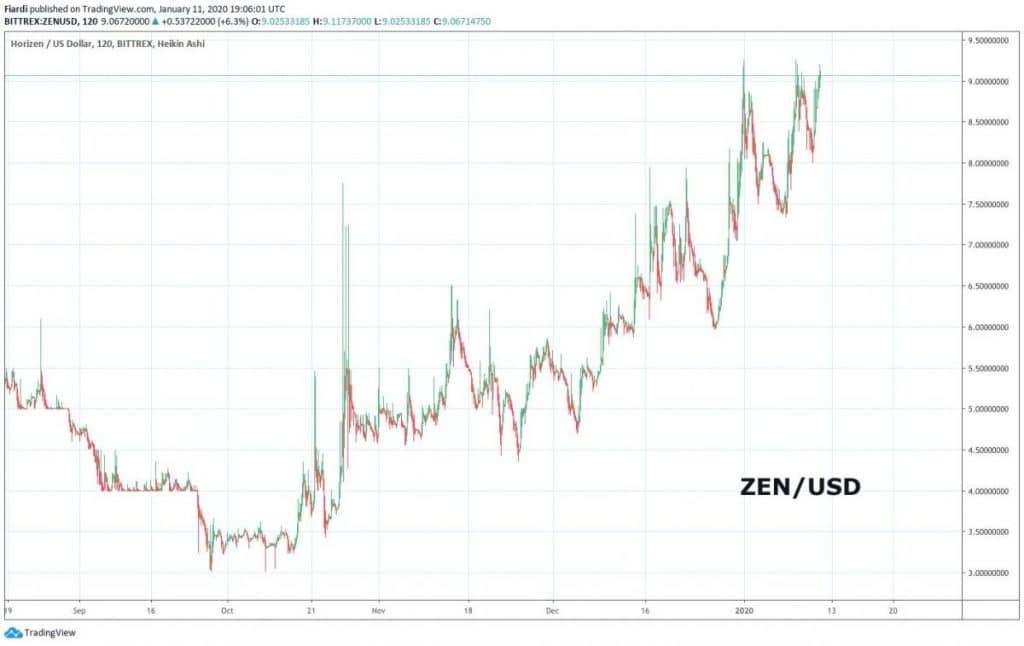 ZEN včera přidal na růstu 10,85%, ale není to jen o včerejším růstu. ZEN od dna na 3,01 USD přidal již 200% a celkově se pohybuje v sestupném kanálu. Díky tomuto růstu je ZEN v bull run již od 10. října 2019. Včerejší hodnota byla 9,04 USD.