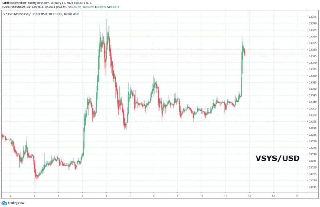 V Systems dnes 3 nejlepší coin v růstu z top 100 podle kapitalizace posílil, poté, co předvedl pumpu o velikosti 12,84%. Celkově si v roce 2020 vede velmi dobře a dostal se téměř na 30% zhodnocení za rok 2020.