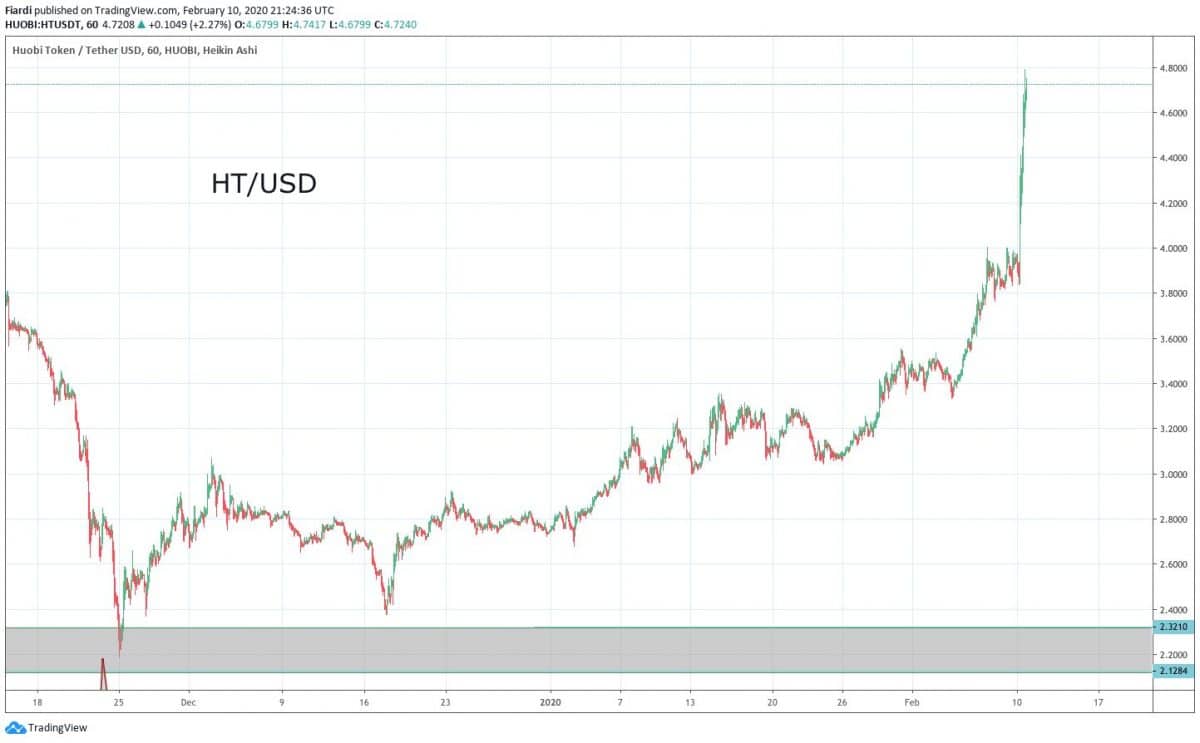 Bitcoin včera v propadu o téměř 500 USD, aleHuobi token přidal pumpu o velikosti 32%, špatně si nevede ani Binance Coin, který se za poslední týden řádně rozjel.