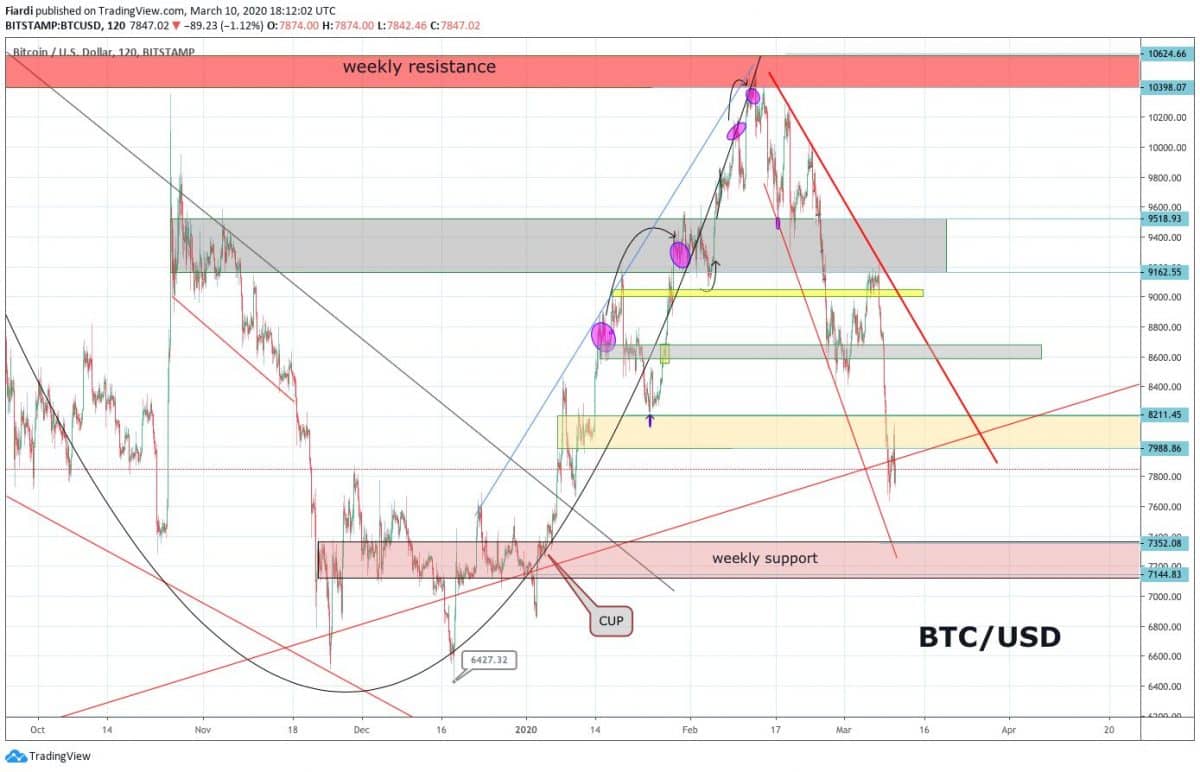 Nejbližší podporu vidíme na hodnotách 7 400 – 7 000 USD. Tato podpora vyplývá z odrazu po 6měsíčním bear trendu z léta roku 2019. Začátkem roku 2020 vidíme silný odraz na 7 000 – 7 400 USD a dá se předpokládat, že pokud se situace neuklidní, tak se sem možná znovu podíváme. Samozřejmě nebude to jen o pádu Bitcoinu, jak to vidíme i nyní. Pokud naopak začneme mírně vlnkovat směrem nahoru, tak nejspíše jen k hodnotě 8 500 USD, kde se momentálně nachází rezistence. Další rezistence poté vidíme na 8 700 a 9 100 USD.