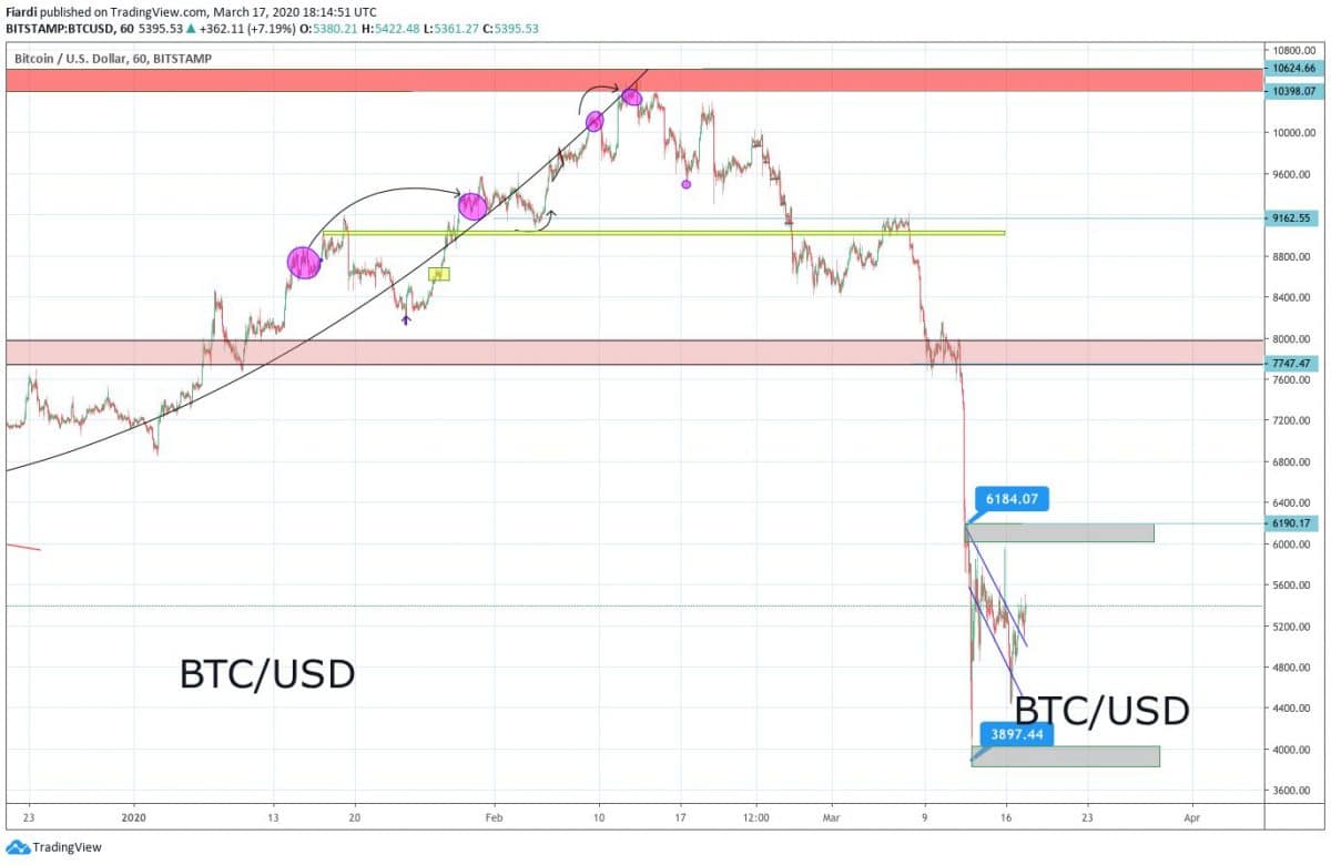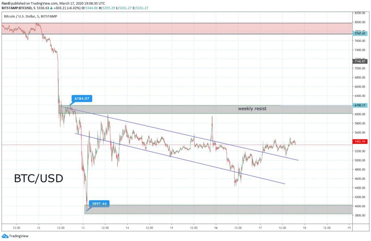 Podporu momentálně vidíme na hodnotách 5 000 USD a následně na 4 000 USD. Než se podíváme směrem nahoru, doporučuji pečlivě sledovat hodnoty podpor. Pokud se situace ohledně koronaviru ve světě nedá do pořádku, nemůžeme čekat bull run a hodnoty, z nichž jsme spadli.