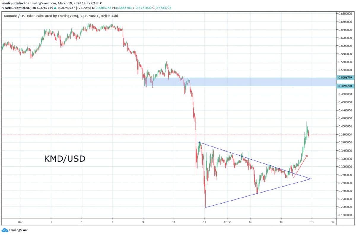 Komodo dnes zazářilo 78% růstem. Pokud se podíváme na graf KMD a graf BTC, vidíme na něm dosti podobný triangl. Netřeba připomínat, že pokud bude růst BTC, bude i KMD v mnohem větších procentních ziscích. Obávám se ale toho, že po včerejším růstu dnes může trh dostat trošku po čumáku a uvidíme mírný propad. Momentální odpor je na hodnotách 0,49 USD. Současná hodnota mince je na 0,38 USD. Nejbližší podpora pak je na 0,27 USD.