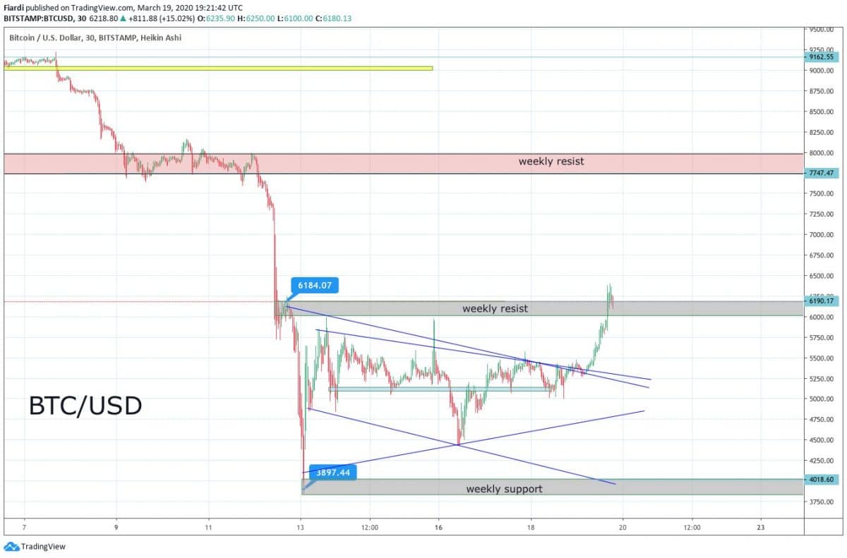 Bitcoin dnes úspěšně prorazil 6 000 USD. Momentálně se pohybujeme na 6 200 a jsme v pásmu rezistence. Pokud udržíme tyto hodnoty, můžeme růst k 7 700 USD, kde je poté další odpor. Pozor ale na víkend! V neděli to může být zase o propadech, protože v pondělí se otevřou světové burzy. Zřejmě v tomto týdnu budeme vidět konsolidaci či dokonce růst. Příznivé zprávy, které dnes přišly, způsobily růst i na světových trzích.