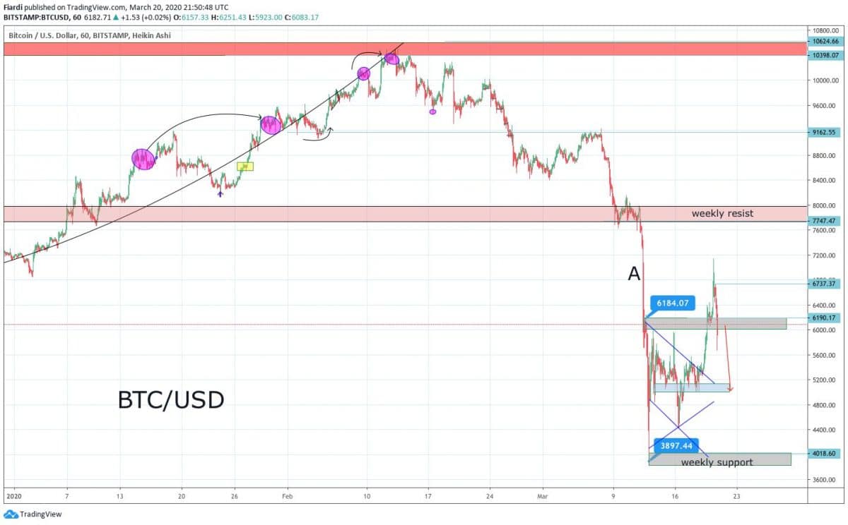 Bitcoin v pátek odpoledne na 7 100 USD. Večer se už pohyboval na 6 000 USD. Na této hodnotě vidíme podporu, pokud ji neudržíme, mohou to bears stáhnout k 5 000 USD. Všechno se to bude odrážet od 6 000 USD. Je to jednoduché, pokud udržíme 6 000 USD, můžeme růst dále. Pokud to neudržíme, čekají nás podpory na 5 000 a 4 000 USD. Důvodem propadu v pátek večer jsou znovu propady na světových trzích. Bitcoin je momentálně v rukou světových trhů a ty zas v rukou ekonomických omezení, farmacie a lékařů, kteří bojují s koronavirem.